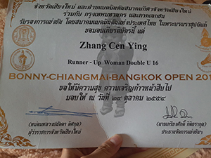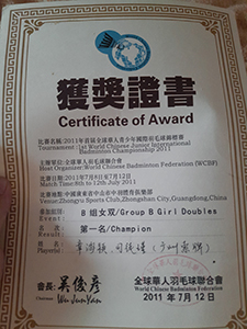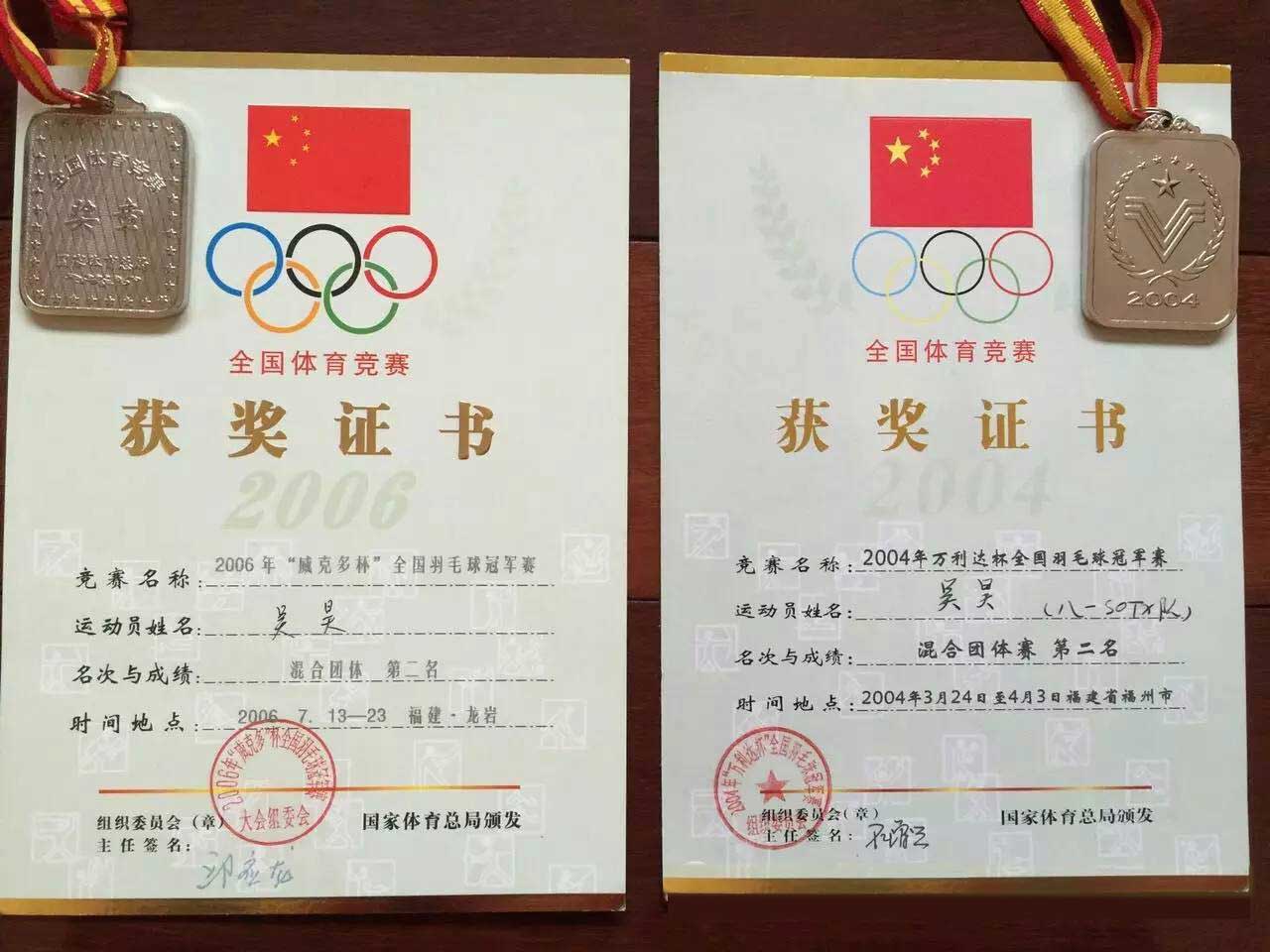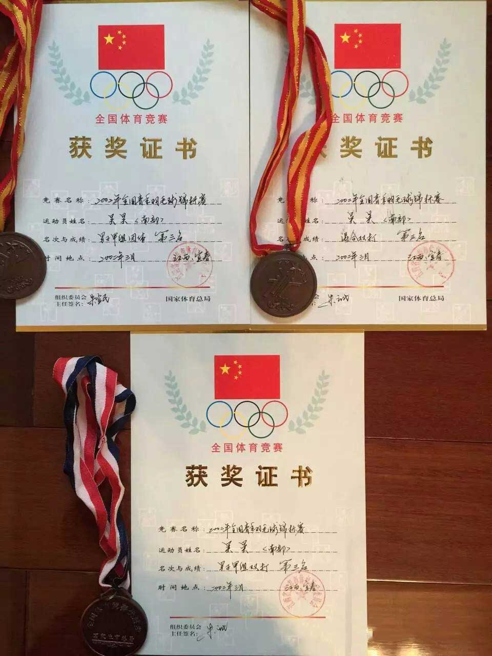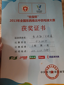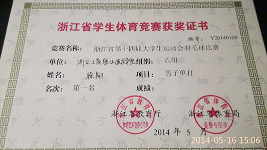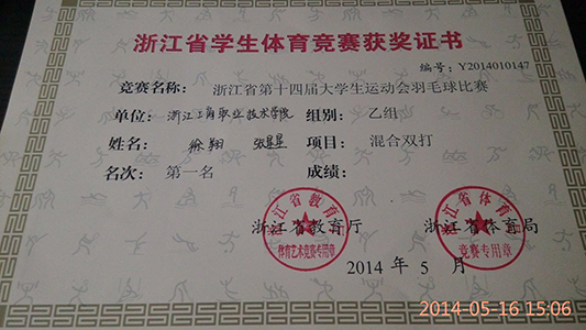 2014年宁波市大学生羽毛球团体第二名,男双第三2016宁波市大学生羽毛球团体第三,个人混双第三,